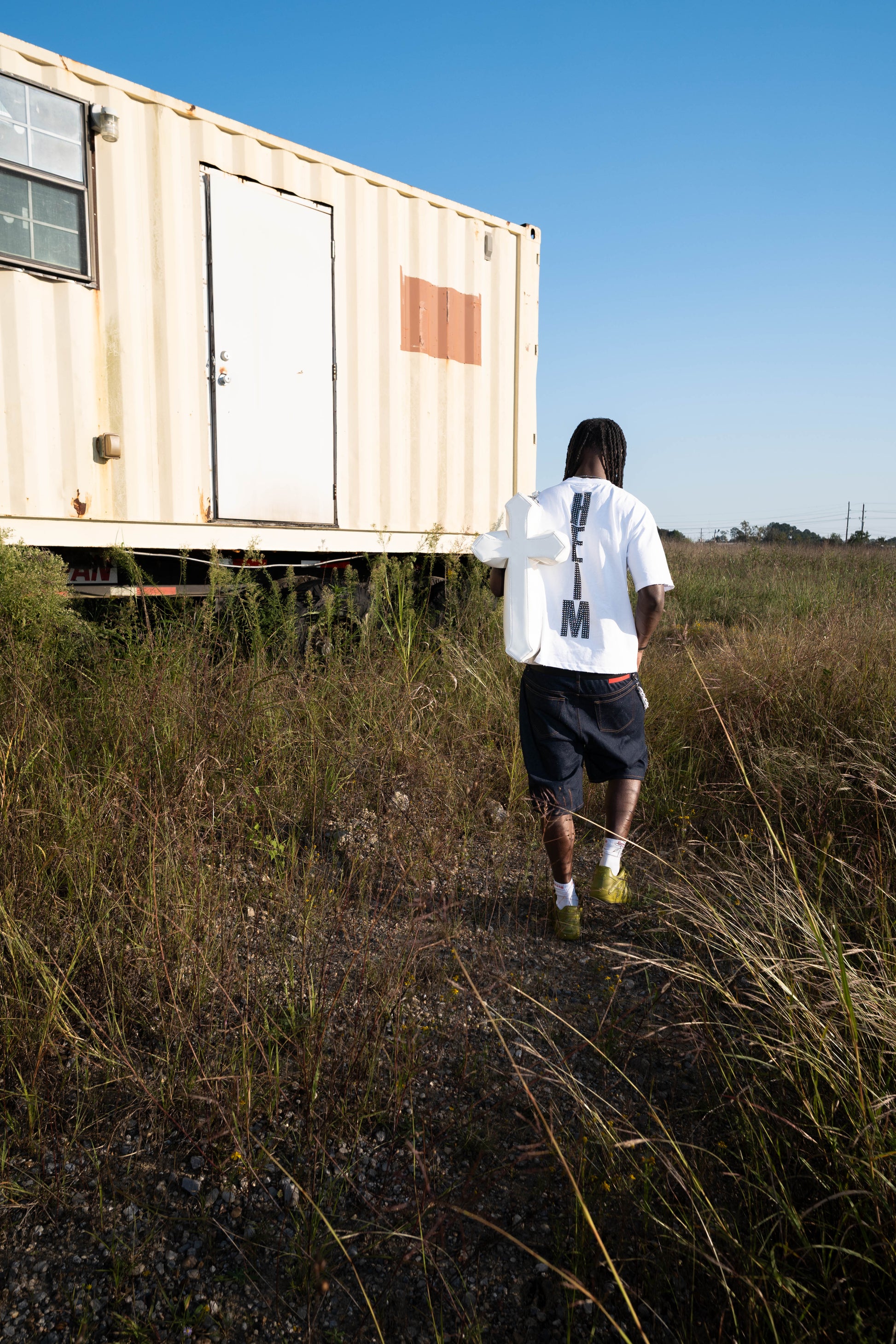 Vertical rhinestone "Heim" lettering on back